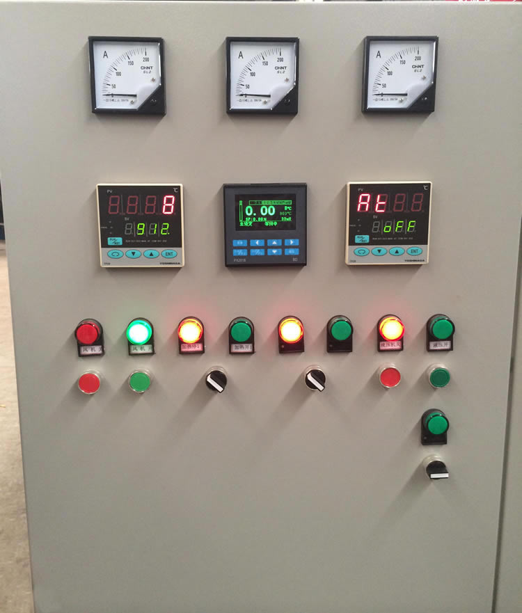 1、控溫儀表采用廈門(mén)宇電AI518AP-G-L1智能程序控制儀表,精度0.3級(jí),控溫偏可達(dá)±2℃。人機(jī)界面采用深圳W EINVIEW威綸7吋觸摸屏,通過(guò)通信協(xié)議與智能儀表相連,把儀表操作菜單在觸摸屏**展開(kāi),這樣操作更真觀,更方便,在不更改儀表參數(shù)時(shí),觸摸屏顯示電爐各區(qū)的工作狀態(tài)。(用戶(hù)可以有選擇性的采用)